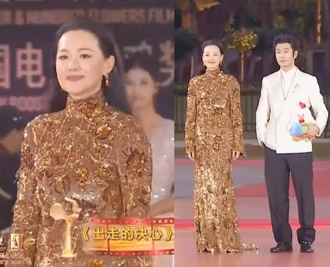 穿了金色亮片礼服的咏梅,女王气场十足,散发着要拿下金鸡奖的气势,只可惜她最终没能凭《出走的决心》拿下最佳女主角。对比之下身旁的黄晓明都没有半点霸总气场了,仅仅像个帅气的助理。