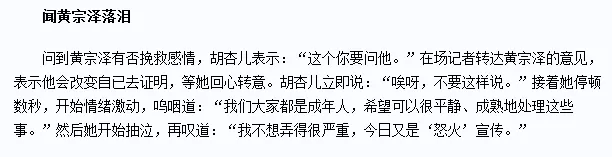 2012年,胡杏儿一人单方面宣布两人感情结束。被问及黄宗泽问题时,本应专业的她忍不住落泪,表示:“我们大家都是成年人,希望可以很平静、成熟地处理这些事。”