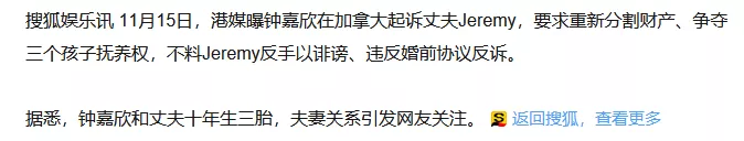 报道中提到,钟嘉欣正在起诉丈夫,要求将两人的财产重新分割。