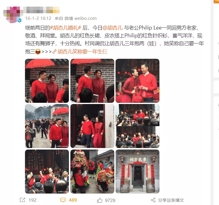 早在胡杏儿订婚时,就有不少她的老乡祝福她三年抱俩,事实上也确实是生了三个孩子。