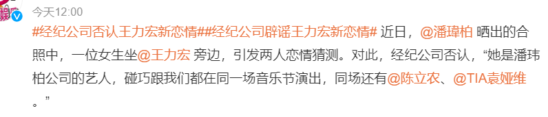 而就在网友热议之际,王力宏经纪公司回应了,称该女生其实是潘玮柏公司的艺人,只不过当时碰巧都在同一场音乐节演出而已,同场的还有袁维娅、陈立农。