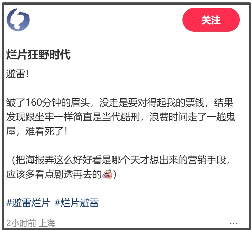 据了解,《狂野时代》上映当天,“《狂野时代》看不懂”的词条就登上了热搜。当越来越多的观众入场,口碑发酵的也越来越快,观众不再保留情面地用“看不明白”等委婉的词汇点评,而是直接将影片定义为烂片。