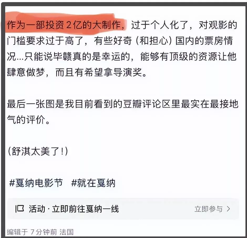 此外,还有观看了《狂野时代》戛纳首映的业内人士透露称该片是一部投资高达2亿的大制作。照目前的票房走势来看,2亿的制作成本不仅收不回,还要大大地赔本了。