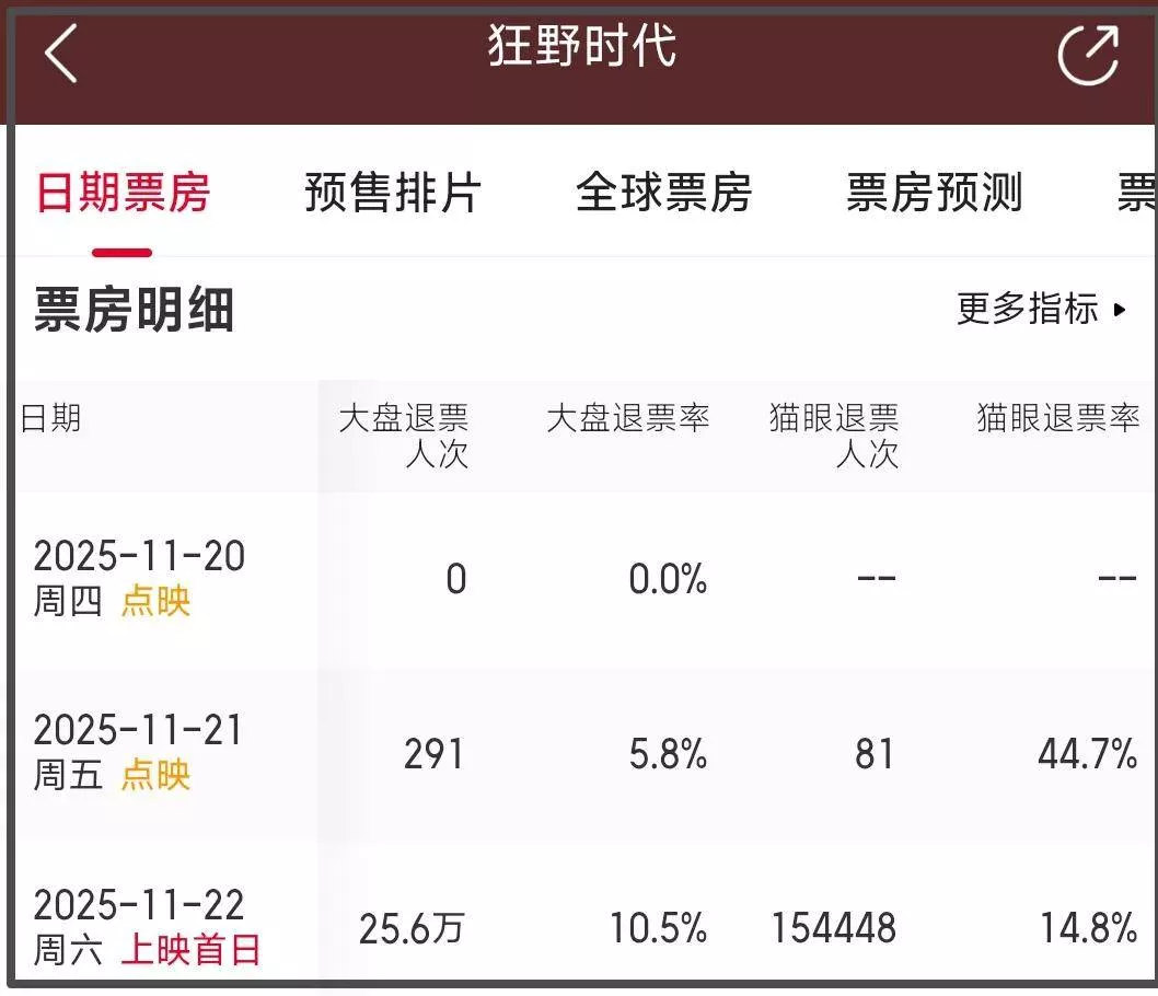 从公开数据中可以看到,《狂野时代》上映首日退票率居高不下,大盘退票人次多达25.6万,退票率高达10.5%,某售票平台退票人次达到15万,退票率更是达到14.8%。