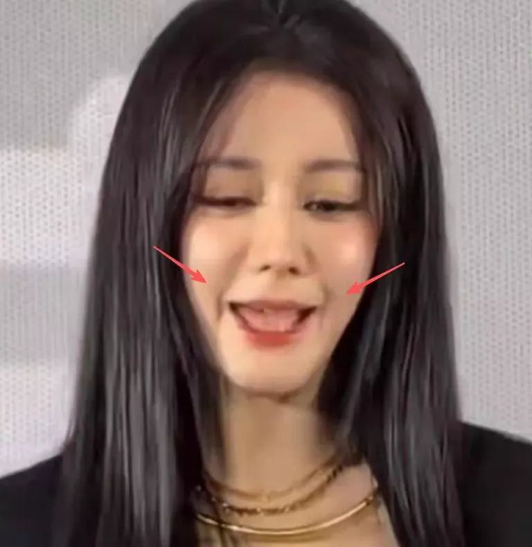 在没有表情的情况下,迪丽热巴的脸还只是浮肿明显,当她做出微笑的表情,或者说话的时候,她口周问题也被显露出来。嘴呈现出明显的不对称,下嘴唇越来越向右边歪;在做表情的时候,她鼻翼两侧的法令纹也挤压了出来。