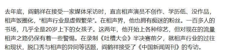 在相声圈里,阎鹤祥是个特别的存在。 他公开批评相声行业“虚假繁荣”,指出很多演员文化底蕴不够、创作能力不足。