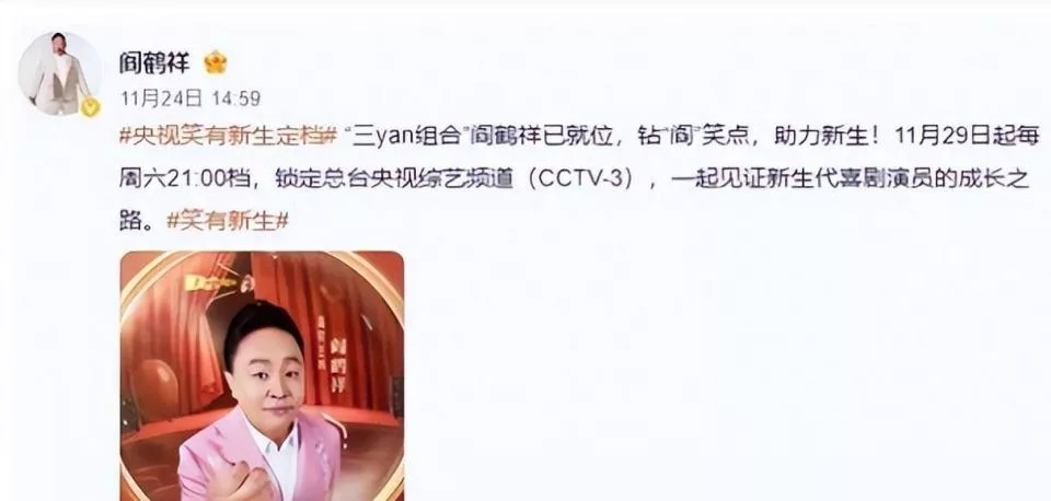阎鹤祥在社交媒体上晒出央视海报的那一刻,德云社的粉丝群炸开了锅。海报上的他穿着笔挺的西装,精神抖擞,完全看不出已经44岁。 节目定档11月29日起每周六晚9点,时间段选得相当黄金。