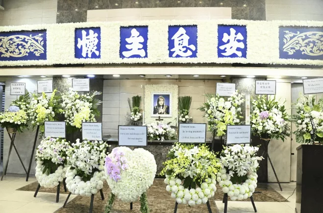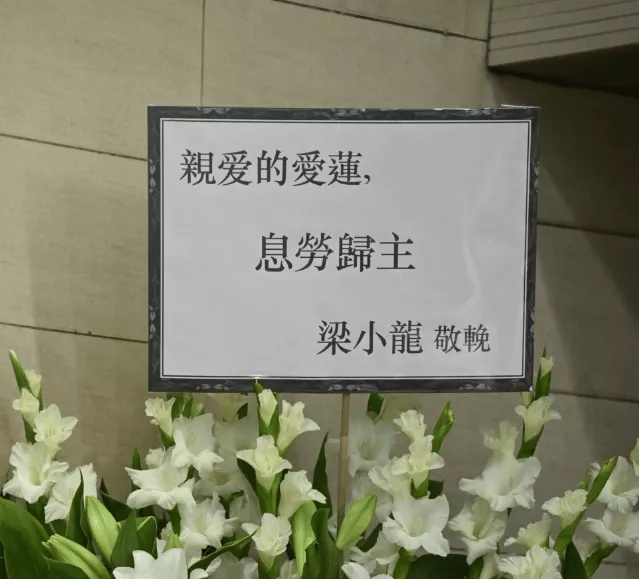 黎爱莲的灵堂一片花海,包括好友黄淑仪、邱礼涛、姜大卫夫妇等现身送别,前夫梁小龙则送上花圈,挽联写着“息劳归主”四字送别前妻。