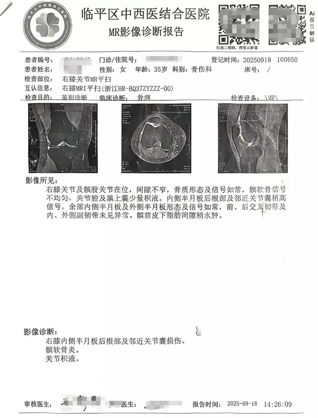 据其提供的诊断报告显示,王女士在9月18日、24日及10月2日、8日、9日、11日相继前往临平区中西医结合医院进行MR影像诊断,诊断结果为“右膝内侧半月板部及邻近关节囊损伤、髌软骨炎、关节积液、腰椎骨质增生、周围软组织轻度水肿、膝周皮肤及皮下水肿”等多部位损伤。