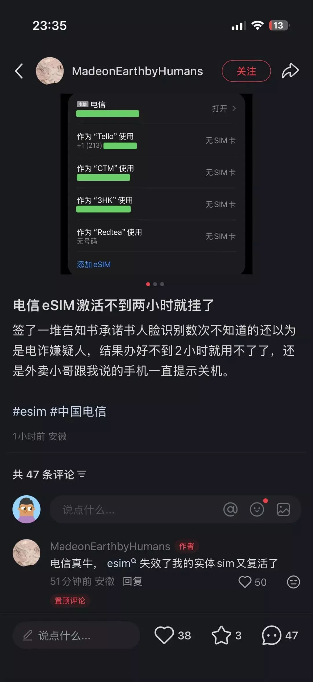 eSIM在国内的使用方式也比人们想象的更「克制」。以国行iPhoneAir为例:更换设备时,国内eSIM用户无法像海外用户那样一键转移,必须再跑一次营业厅;部分小红书用户更是反映自己的eSIM「无缘无故失效」,刚用两天就得回营业厅。