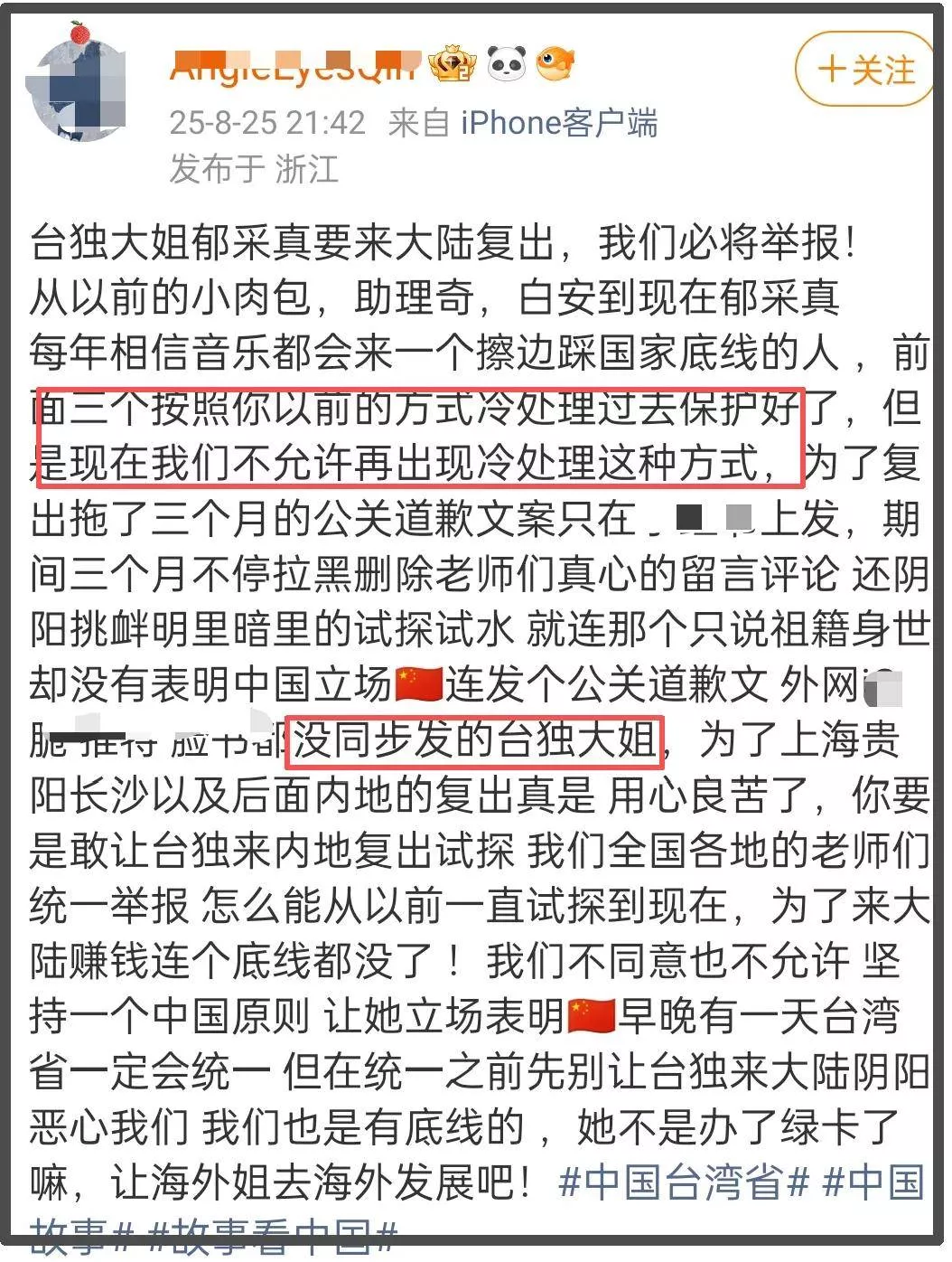 另外,五月天的粉丝从8月就在抵制郁采真,声称只要来内地复出就必举报,还表明相信音乐每年都会塞一个立场有问题的艺人,五月天往往都冷处理保护,这一次不能接受冷处理。从如今的空降及阿信在台上的“卖惨”言论来看,相当于是支持了。